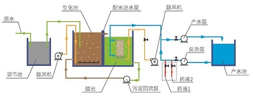 膜強(qiáng)化生物技術(shù)(MBR)是膜分離技術(shù)與生物技術(shù)有機(jī)結(jié)合,由于微生物被完全截流在生物反應(yīng)器內(nèi),從而有利于增殖緩慢的微生物如硝化細(xì)菌的截留生長(zhǎng),系統(tǒng)硝化效率得以提高。同時(shí),可增長(zhǎng)水力停留時(shí)間,有利于難降解有機(jī)物降解效率的提高和強(qiáng)化脫氮除磷效應(yīng)。