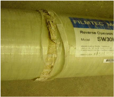 膜元件可能會遭遇稱為望遠鏡現(xiàn)象的機械損壞,膜元件的外包皮與膜元件錯開并移向下游,甚至套到下一支膜元件上,輕微的望遠鏡現(xiàn)象不一定會損傷膜元件,但嚴重時,可能會造成粘接線和膜片的破裂。