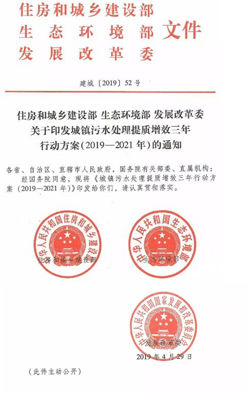 為貫徹落實(shí)全國生態(tài)環(huán)境保護(hù)大會、中央經(jīng)濟(jì)工作會議精神和《政府工作報告》部署要求,加快補(bǔ)齊城鎮(zhèn)污水收集和處理設(shè)施短板,盡快實(shí)現(xiàn)污水管網(wǎng)全覆蓋、全收集、全處理,經(jīng)國務(wù)院同意,住房和城鄉(xiāng)建設(shè)部、生態(tài)環(huán)境部、發(fā)展改革委印發(fā)《城鎮(zhèn)污水處理提質(zhì)增效三年行動方案(2019-2021年)》(建城〔2019〕52號,2019年4月29日)。