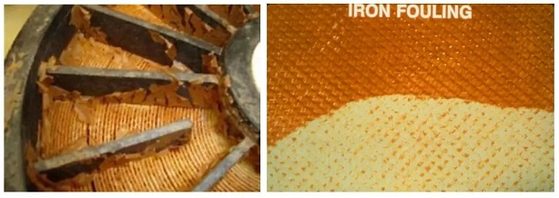 芬頓反應(yīng)采用硫酸亞鐵作為催化劑,過氧化氫作為氧化劑來氧化降解廢水中的COD有機物。與臭氧工藝相比,芬頓法的成本較低,因此在許多高濃度有機廢水處理中得到了廣泛應(yīng)用。廢水經(jīng)芬頓法處理之后,一般會殘留>1mg/l的亞鐵離子。由于亞鐵離子為溶解性成分,在UF+NF/RO的雙膜法工藝中,溶解性的亞鐵離子會一直透過所有的過濾介質(zhì)直到納濾進水池。而由于控制微生物的需求,我們需要在進水池中保持一定的余氯,于是,亞鐵離子會被余氯部分氧化,形成難溶的氫氧化鐵。這一點是對納濾最大的危害。