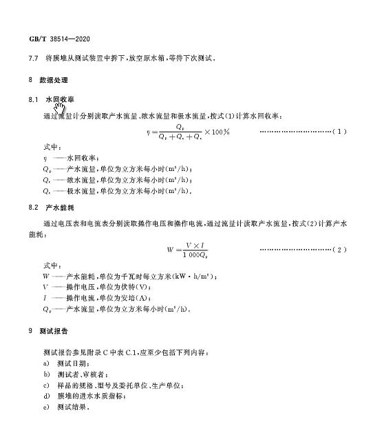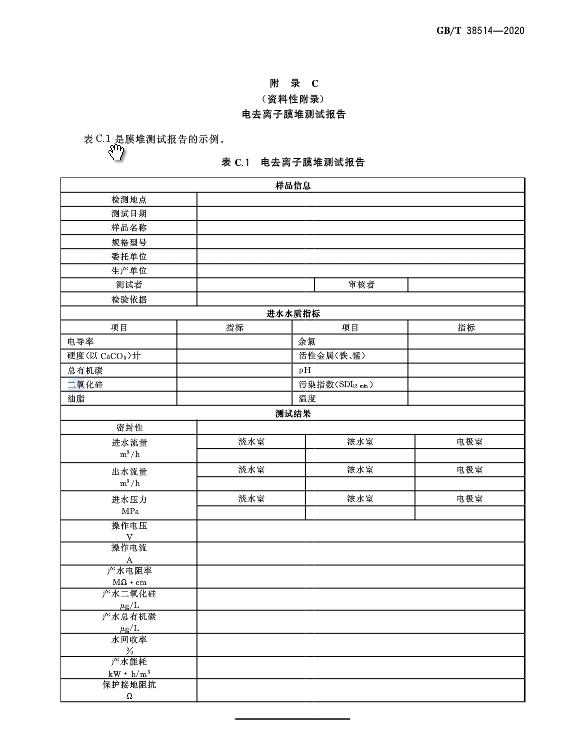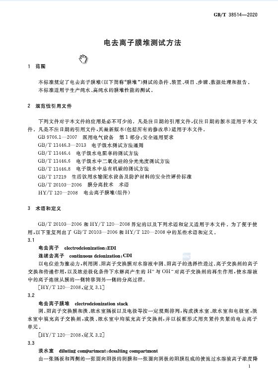 《電去離子膜堆測(cè)試方法》GB/T 38514-2020于近日發(fā)布,2021年2月1日起施行。