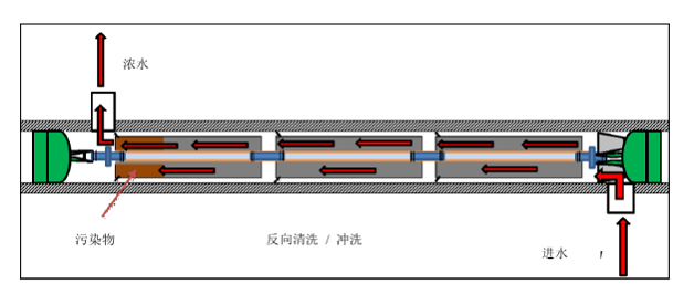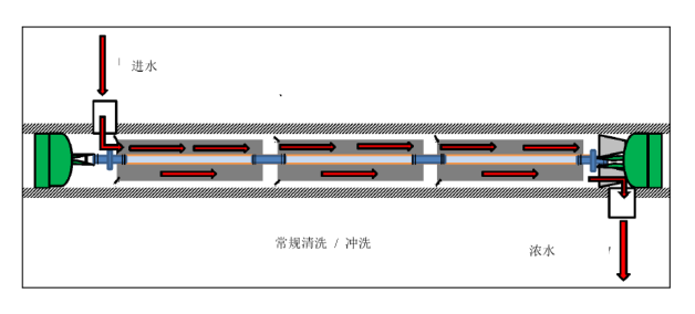 常見的反滲透的沖洗設(shè)計(jì)一般是從壓力容器進(jìn)水端流入,經(jīng)過膜元件后從壓力容器濃水端流出,這個(gè)流向與反滲透系統(tǒng)正常運(yùn)行時(shí)是一樣的。反滲透的反向沖洗指的是由濃水端向進(jìn)水端方向進(jìn)行沖洗的過程, 反向沖洗有助于去除反滲透系統(tǒng)的前端污染物,采用此方法進(jìn)行沖洗反滲透膜元件受到的污染更?。划?dāng)有顆粒物(細(xì)砂、活性炭)時(shí),必須采用此方法,以免反滲透膜表面被劃傷。需要注意的是任何時(shí)候嚴(yán)禁由產(chǎn)水端向進(jìn)水端進(jìn)行沖洗,這會(huì)造成反滲透膜元件背壓,使反滲透膜元件受到不可逆轉(zhuǎn)的損害。