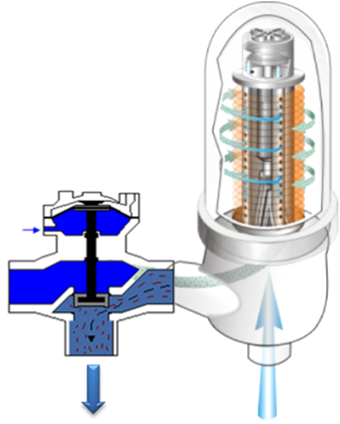 當(dāng)盤式過濾器疊片之間的溝紋累積大量雜質(zhì)后,進(jìn)出口壓差達(dá)設(shè)定值時(shí)(高報(bào)警),三通閥門改變過濾單元中水的流向,盤片被頂開,過濾過程中的小孔隙被打開。位于疊片中央的噴嘴沿切線噴水,使疊片旋轉(zhuǎn),在水流的沖洗與疊片高速旋轉(zhuǎn)下,截留在疊片上的固體物被沖洗出去。然后活塞再次下壓疊片,回復(fù)過濾狀態(tài)。當(dāng)反沖結(jié)束時(shí),水流方向再次改變,疊片再次被壓緊,系統(tǒng)重新進(jìn)入過濾狀態(tài)。