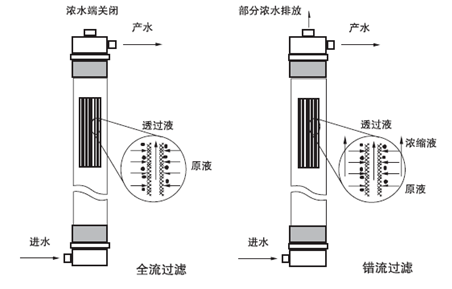 超濾系統(tǒng)可以按照全流或死端過濾、錯(cuò)流過濾(Cross-flow)兩種運(yùn)行模式操作。